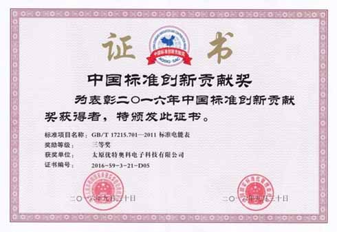 我公司作為國家標(biāo)準(zhǔn)《GB/T17215.701標(biāo)準(zhǔn)電能表》的主要起草單位獲得了2016年中國標(biāo)準(zhǔn)創(chuàng)新貢獻(xiàn)獎(jiǎng)。