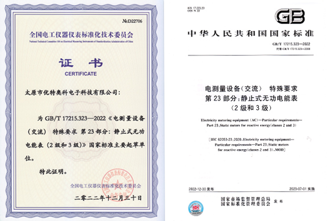 優(yōu)特奧科作為主要起草單位的國(guó)家標(biāo)準(zhǔn)《GB/T17215.323-2022電測(cè)量設(shè)備(交流)特殊要求 第23部分:靜止式無功電能表(2級(jí)和3級(jí))》于2022年12月30日發(fā)布,2023年7月1日實(shí)施。